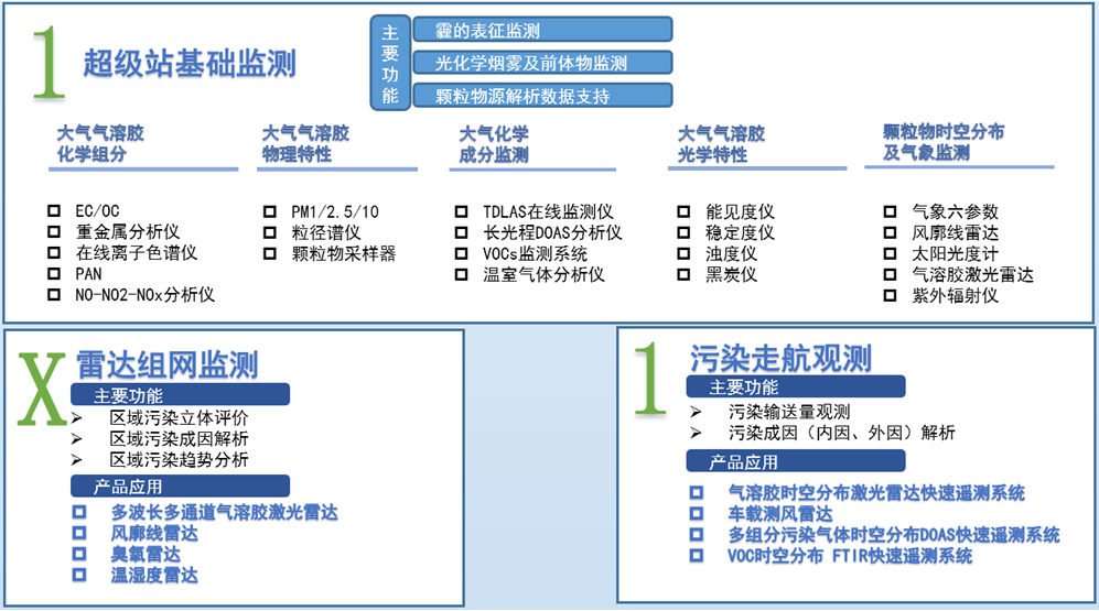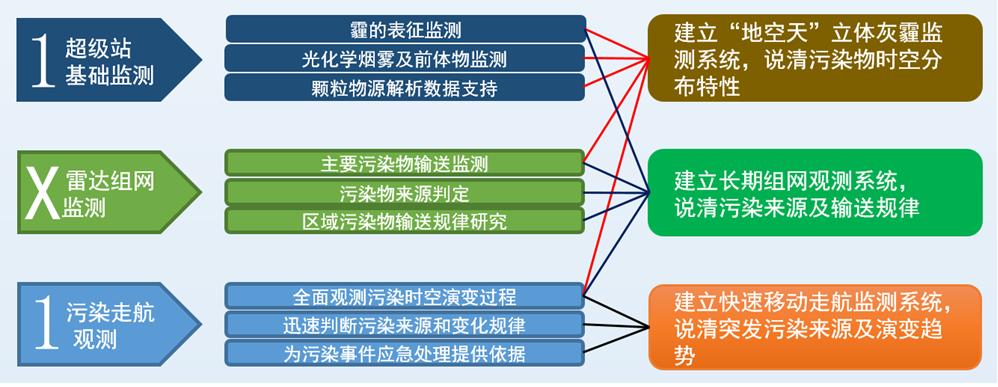 方案采用超级站基础监测平台(灰霾物化特性监测)、雷达组网监测平台和污染走航观测平台(简称“1+X+1”)的应用模式 ,并结合外源(卫星)数据分析 ,综合解决以上问题 。主要解决城市灰霾污染分析体系建设、区域污染传输影响以及污染来源分析问题 ,为颗粒物源解析、区域污染预 警预报提供数据支撑 。